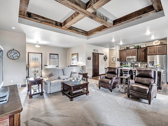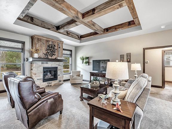 Upgrades galore-this is not your cookie cutter! This open concept ranch with split bedroom design boasts almost 1900 sq. ft. Enter into the large foyer with gorgeous floors that flow throughout much of the main level. A spacious living room with coffered ceiling has wood beams and cozy fireplace with wood mantel and stone bottom will be your first view. The large kitchen/dinette features a large pantry with a barn style sliding door, maple cabinets, tiled backsplash, center island/snack bar, stainless appliances, hook up for gas or electric stove & quartz countertops. The Master Bedroom features a tray ceiling, while the attached full bathroom offers dual sinks and a beautiful tiled walk-in shower, plus a walk-in closet. Two additional bedrooms offer walk in closets and tray ceilings! 1st floor laundry with pull out dryer rack, pocket door, plus washer and dryer are included! Located off the spacious 3.5 finished and insulated garage with basement access is a cute back entry way with bench seat and cedar backing plank, plus a drop station. Large and meticulously maintained backyard with stunning aluminum fence with bronze finish, covered back porch off the dinette with a patio door & 2 patios! Security Cameras, smart light switches, Nest Doorbell, Sprinkler system in the front and more! This Focus on Energy Certified Home will meet all your needs and more! Better than new construction and won't last long!