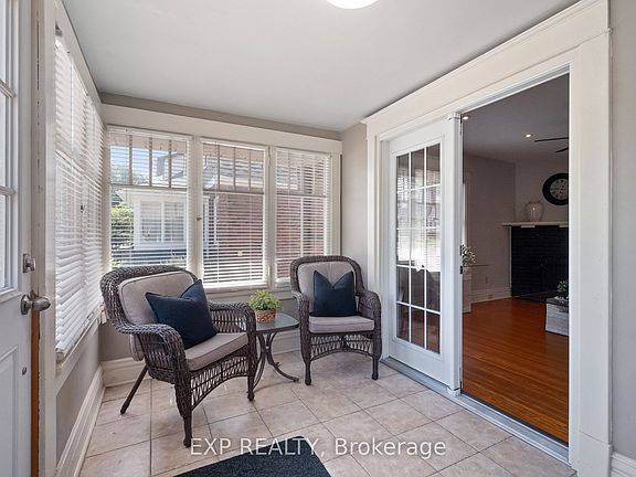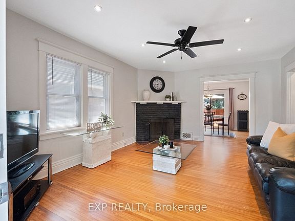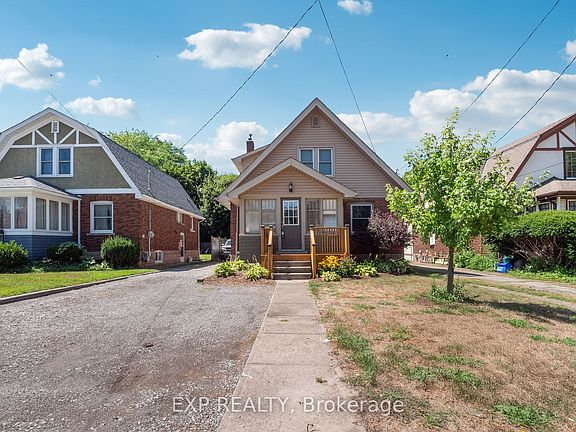 CURB APPEAL, CHARACTER, AND CONVENIENCE! This 1.5-storey home in central Niagara Falls offers a blend of charm and functionality, starting with landscaped grounds, a welcoming front porch, and parking for five between the long double driveway and detached garage. Step inside through the enclosed sunroom with tile flooring and walls of windows, leading to a warm living room with hardwood floors, classic wood trim, pot lights, and a brick wood-burning fireplace. The dining area is filled with natural light and opens to the backyard deck, while the tiled kitchen offers two bright windows and easy flow to the main living spaces. A flexible main floor room provides the option of a bedroom or office. Upstairs, two spacious bedrooms feature hardwood floors and bright windows, complemented by a four-piece bath. The finished lower level, complete with a separate entrance, offers an in-law suite with a kitchen, island, living area, bedroom, three-piece bath, and laundry with added storage. Outside, enjoy a landscaped yard, private deck, and plenty of room for entertaining or relaxing. Updates include a newer roof, furnace, and hot water tank, making this home an ideal choice for families or those seeking versatile living options in a central location close to shopping, schools, parks, and highway access.