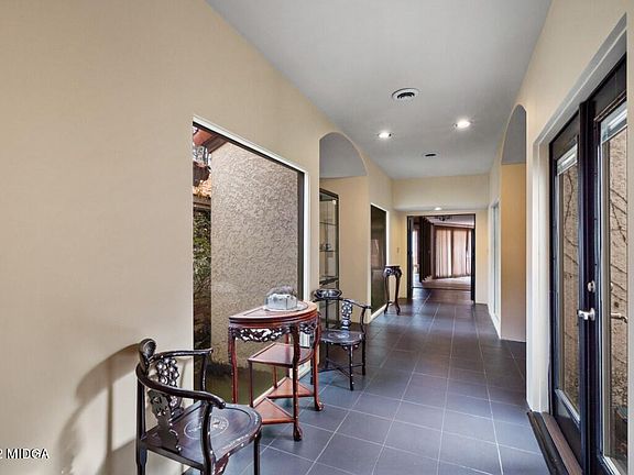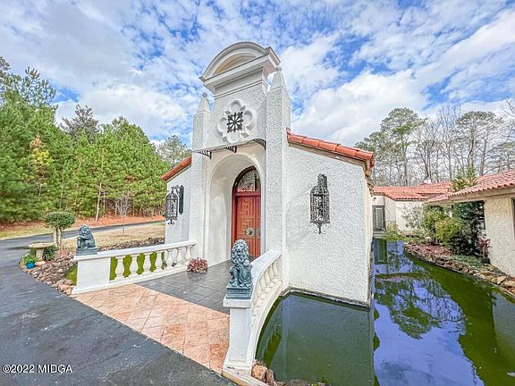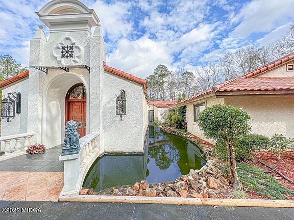 One of a kind beautiful Mediterranean estate on 8.81 acre in Prime North Macon. Once you enter through the circular driveway & iron gates you are welcomed to a sanctuary surrounded by a unique koi pond & fountain. The impressive solid double doors host a grand entry that leads down to the main quarters. Living room & Den with fireplace, heated ceramic tile floors, large kitchen with island, stainless steel appliances, double sinks, eat-in kitchen & separate dining room with elegant chandeliers. Two spacious Master suites, main master hosts vaulted cypress ceiling that overlooks pool with wrap around deck; two separate jacuzzi areas, 18x36 heated pool, cabana with two full baths & enclosure for year around swimming. Eight car garage, tennis courts, wet bar, sauna, solarium, and exercise room too. Six bedroom with eight bathrooms. Additional room in basement could be seventh. Great for generational living. Backyard features balcony overlooking private wooden area with stream. Don't miss this rare opportunity