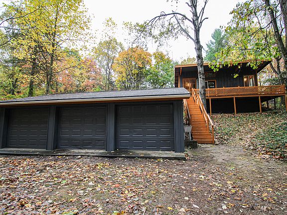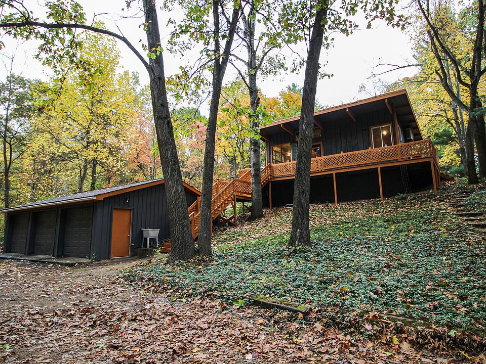 Rustic, Relaxing & Tranquil. Discover this fully furnished 2bed, 1 bath, 1,138 sq. ft. home on just over 4 wooded acres. Built in the 1970s & thoughtfully updated, this cozy cabin-style property features an open-concept layout w/ vaulted knotty-pine ceilings, hardwood floors, & a double-sided brick fireplace with wood-burning cookstove. The kitchen offers stainless-steel appliances, gas range, & new sink. Additional features include a metal roof, updated bath, walk-in cedar closet, & newer full-size washer/dryer. Modern efficiency upgrades include a 3-head mini-split heating & cooling system, heat-pump water heater, whole-house water filtration, & a 60' solar array tied to the grid, nickel-hybrid battery system for future off-grid capability. Enjoy a wrap-around deck with fresh stain, newer metal roof, new stairs, & a large 32'x25' 3-stall garage. The property also offers seasonal lake views, a 6-person walk-in outdoor sauna, fenced perimeter with gated entry, dog run & mature trees. Located across from Pleasant Lake public access & minutes from town the ideal mix of convenience and nature.