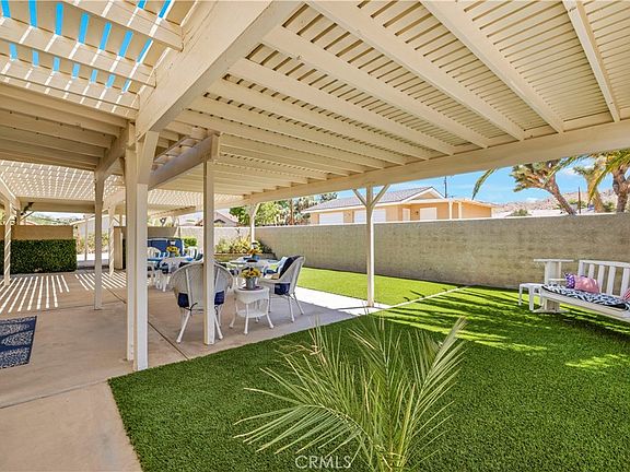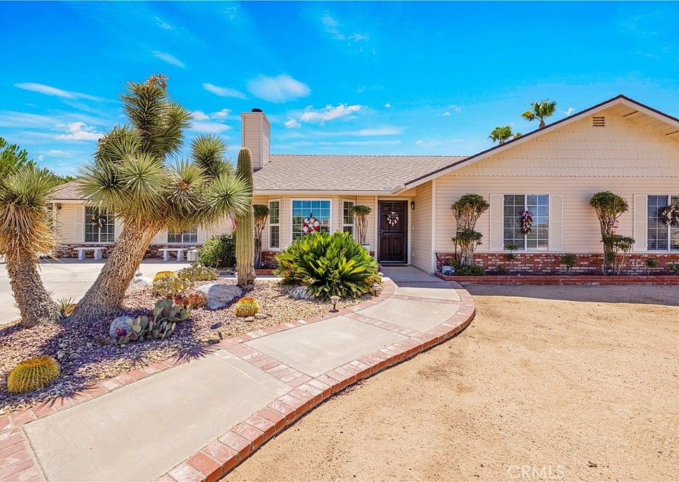 Welcome to this well-maintained 3-bedroom, 2-bathroom, 2,123 sq ft home located in the highly desirable Sky Harbor neighborhood of Yucca Valley. Situated on nearly a full acre thanks to an included adjacent lot, this property offers space, versatility, and privacy—perfect for desert living. Step inside and you’re welcomed by a cozy living room with a classic brick fireplace, tall vaulted ceilings, and a seamless flow into the dining area and massive kitchen. The kitchen is a standout feature with granite countertops, ample cabinetry, and two additional dining spaces at the peninsula and the breakfast nook overlooking the backyard. Just off the main living space is a spacious family room or den that can be closed off for privacy, making it an ideal option for a second living area, media room, office, or guest space. All bedrooms offer plenty of space, with the primary suite featuring a walk-in, no-step shower, direct access to the backyard, and a converted walk-in closet so large it used to be a bedroom—providing incredible storage or flex space. Outside, the backyard is an entertainer’s dream. Enjoy the massive covered patio, swim spa, and turf landscaping surrounded by block walls for privacy. The lot includes a detached 2-car garage, an additional shed, and RV parking with hookups. A driveway extension runs through the additional lot, making RV or trailer access and storage a breeze. This home offers a rare combination of space, thoughtful upgrades, and a highly flexible floorplan in one of Yucca Valley’s most sought-after neighborhoods. Don’t miss your chance to see it in person—schedule your private showing today!