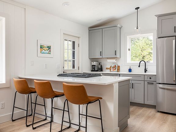 Fully renovated home on the Crystal River in Glen Arbor. Inside, there is a king bedroom, queen bedroom, and a sleeper sofa, along with two full bathrooms (one with a tub), a cozy living room with a double-sided wood-burning fireplace, a fully equipped kitchen, central air conditioning and heating, and a backup generator. Outside, there is a screened-in porch, a barrel sauna, a propane grill, and a fire pit.