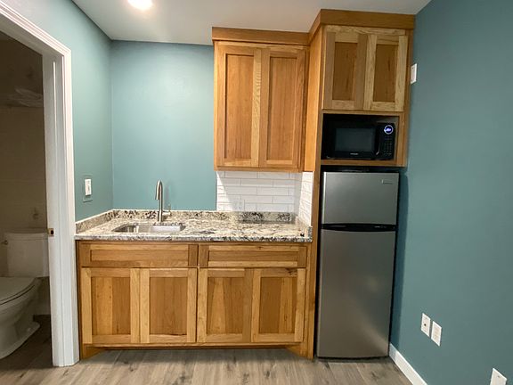 Apartment size refrigeratorKitchenette areaWall mounted roku tvGranite countertopsNew bedframe and mattress