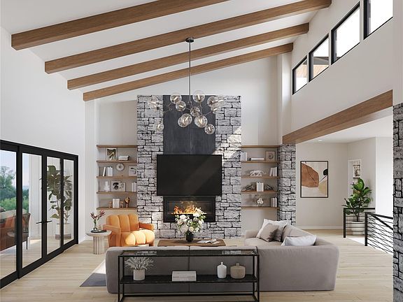 A soaring entry welcomes you into a thoughtfully designed open floorplan anchored by a striking great room with beam-accented ceiling and grand custom fireplace featuring exquisite stone and tile detailing. The chef’s kitchen showcases top-tier lighting, premium cabinetry, professional-grade appliances, and an adjoining dining nook that seamlessly connects form and function. The executive study is richly appointed with custom built-in woodwork, providing a warm and inspiring space to work or unwind.