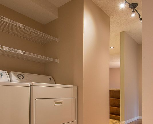 ? Laundry area with shelving and linen closet conveniently between bedrooms.