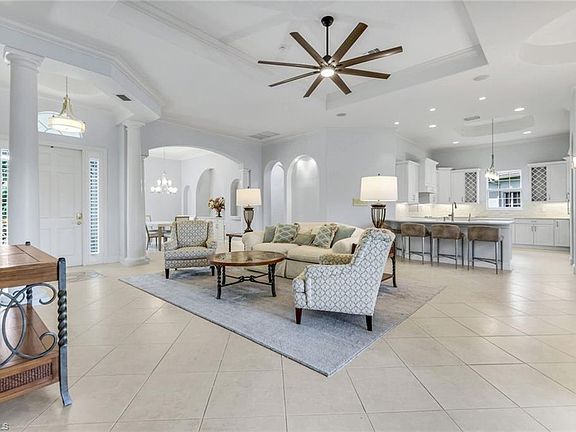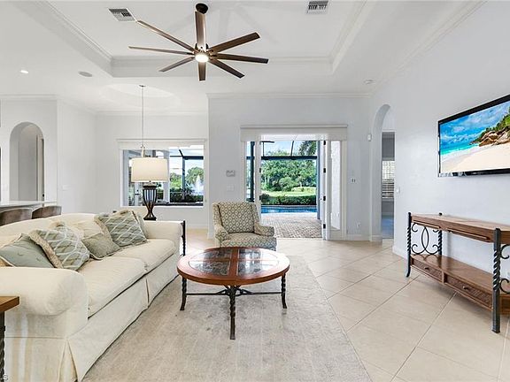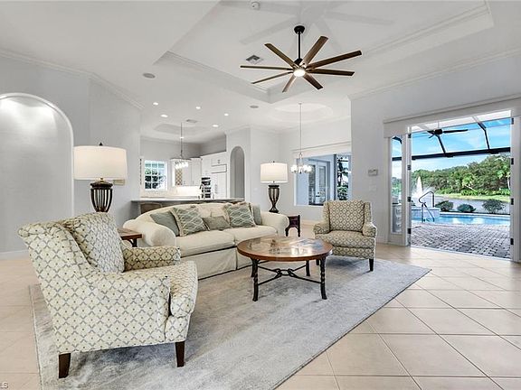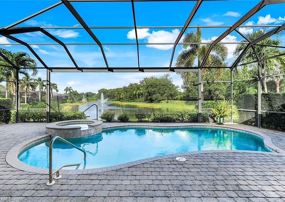 Expansive long lake views with two sparkling fountains and unforgettable evening skies! This stunning 4-bedroom + den, 4.5-bath estate home in Hammock Isles at The Vineyards combines timeless elegance with luxurious updates throughout. Recently refreshed interior, this home truly shines inside and out. Step inside and be greeted by hand-painted ceilings and columns, granite and marble countertops, a Sub-Zero refrigerator, and wood floors in the den. Thoughtful details abound, including crown molding, built-in closets, lighting fixtures and fans. Each bedroom features its own ensuite bathroom, ensuring privacy and comfort for family and guests alike. The home’s true showstopper? A breathtaking western long lake view with double fountains; a perfect setting for magnificent sunsets. Enjoy it all from your extended lanai with with picture window screens, and a large custom pool and spa, surrounded by lush tropical foliage that provides both privacy and beauty. Located within the gated community of Hammock Isles in The Vineyards, this home offers not only luxury but also an exceptional lifestyle. Optional Vineyards Country Club membership available and includes access to a world-class Wellness Center, newly renovated Clubhouse and Pool, Tennis and Pickleball, and two championship 18-hole golf courses. Just minutes from Naples’ world-class beaches, dining, and shopping, this home is the perfect blend of luxury, lifestyle, and location. Once you walk through the front door. You’ll never want to leave.