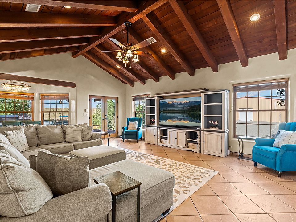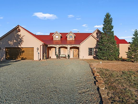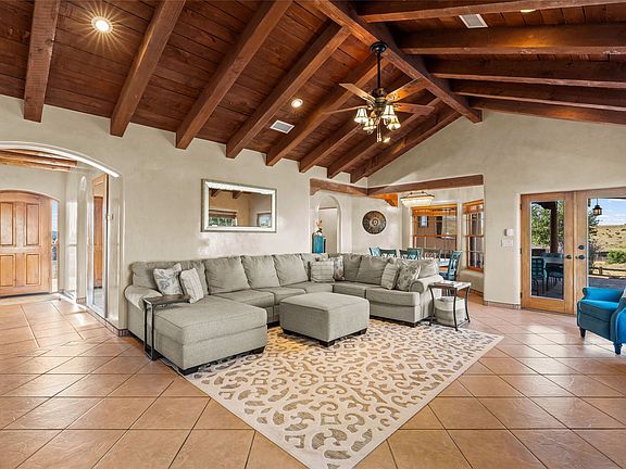 Ideal Equestrian and Sports Retreat! Sited on over 8 acres, this exceptional 4-bedroom, 3-bathroom home and casita offer the ultimate sanctuary for equestrian and outdoor sports enthusiasts. Perched high above the landscape, enjoy unobstructed views of the majestic Sangre de Cristo Mountains and the serene rolling hills that surround you. Main house features hand-plastered walls, tile floors, stunning wood vigas and beams and a pellet stove. Living/dining areas open to a spacious backyard portal, where you can soak in the picturesque views and enjoy the fresh New Mexico air. This outdoor space is perfect for hosting barbecues or simply unwinding in your private oasis. The updated kitchen is appointed with quartz countertops, a center island, and modern appliances. For the equestrian enthusiast, the property includes a 4-stall barn and a versatile arena, currently converted into an exciting go-kart course. The 45x50 indoor gym/garage doubles as a basketball court and lined for pickleball, featuring beautiful wood floors and soaring 24-foot ceilings, allowing for year-round training and fun. Adventure seekers will love the zip line, outdoor soccer field, and the outdoor shower and hot tub—perfect for unwinding after an active day. In addition, there is a separate gym/studio. Attached garage plus an extra detached 30 x 30 finished garage with a 10-foot-high garage door. Conveniently located with easy access to NM-14 and I-25, this property offers a blend of seclusion and accessibility.