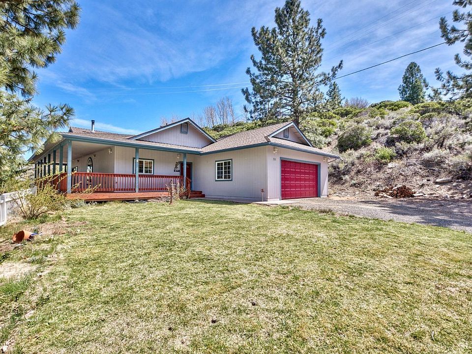 Delightful, sunny and happy one story home with beautiful views of the mountains! Comfortable three bedroom, two bathroom, 1817 sq ft home with an open floor plan. Two closets in the primary bedroom. Cement pad outside the back door has hot tub plumbing and electrical. This home sits at the top of a cul de sac. Centrally located and close to South Lake Tahoe, Kirkwood Ski Resort, and the Carson Valley.