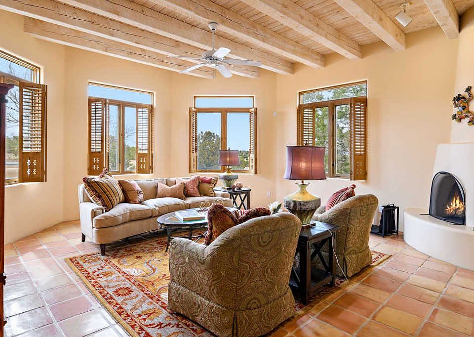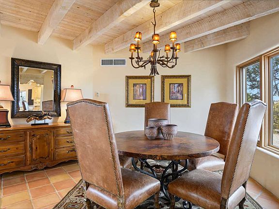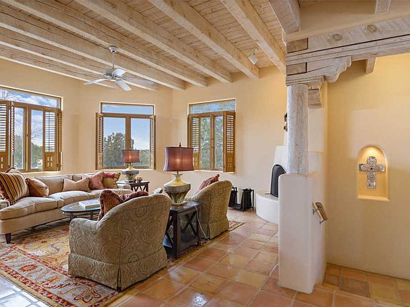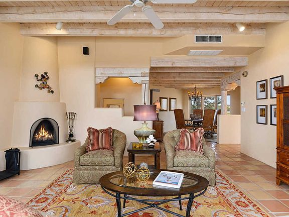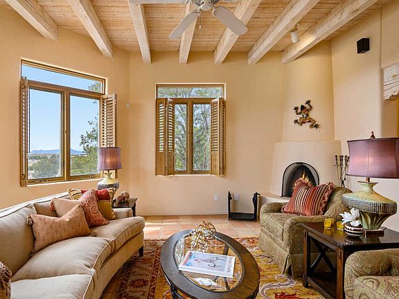 Lovely Santa Fe Style home located on a paved road in popular Eldorado subdivision. Featuring 3 beds/1 office/2 baths/2 car garage and 2381 sf on almost 2 acres, and backs up to open space. This Kim Dressel built home is exceptionally maintained with new stucco. The light filled living room has wonderful windows with custom shutters, plus a kiva fireplace, and high ceiling with vigas. Adjacent to this space is a formal dining area that offers a gathering place for guests. The large kitchen has custom cabinets and granite counter tops plus a casual dining area, here there is a sliding glass door that leads to the portal where you can enjoy views of the mountains. The master bedroom suite includes another kiva fireplace, vigas and a private den or studio space, The master bath has a separate tub and walk in shower 2 sinks and a large walk in closet. The guest bedrooms are nicely separated from the master and common living areas, for ultimate privacy. The house has has forced air and AC.