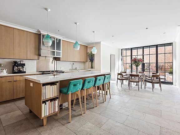 The garden level has its own “below the stoop” entrance with a mud room, high ceilings, a spacious den, powder room, and a spectacular chef’s kitchen leading out to your south-facing rear garden. Cook’s quarters are meticulously appointed with custom cabinetry, a center island with seating, premium stone countertops, and top-of-the-line appliances including a dual Lacanche stove, two Meile dishwashers, and a large Sub-Zero refrigerator.