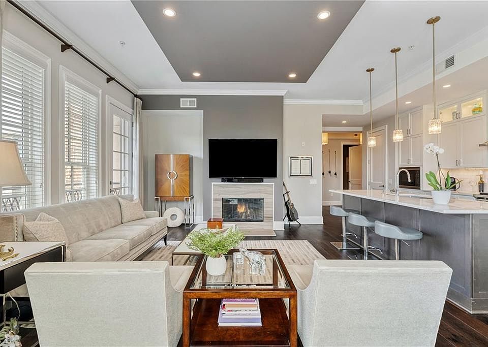 Experience refined living right in the heart of historic downtown Alpharetta. This professionally designed, TOP FLOOR CORNER unit offers 3 bedrooms, 3 full baths, and a seamless 1 level, open-concept layout with soaring ceilings, hardwood floors, oversized windows, and panoramic views of treetops and downtown Alpharetta. The chef’s kitchen is equipped with a Wolf 6-burner gas range, Sub-Zero refrigerator, and premium appliances—perfect for elevated cooking and entertaining. A cozy gas fireplace anchors the living room, while every inch of the home is professionally styled with high-end finishes and refined detail. This residence also includes two dedicated, covered parking spaces, a large private storage unit, and the option to purchase fully furnished—making it the ultimate low-maintenance, lock-and-leave retreat. Enjoy 24/7 secure access and boutique amenities: clubhouse, business center, outdoor lounge with fireplace, grilling stations, and pet-friendly areas. Walk to restaurants, boutiques, live music, Avalon, Publix, Whole Foods, Alpha Loop, and Wills Park. Minutes to GA-400. This isn’t just a home—it’s a lifestyle. A rare opportunity in one of Alpharetta's most desirable communities.