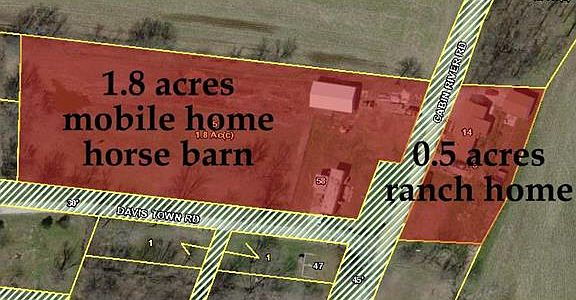 1.8 acres with a 1500 sf HORSE BARN W/ELECTRIC and water perfect for horse grazing & exercise. Separate well agreement is available. The mobile home on the the property gets $750 per month rent. There is a small pond towards the back of the acreage. This is a really nice piece of land with tons of potential. The seller will sell 58 Davis Town Road separately for $18,000 or together with 14 Cabin River Road for $137,500