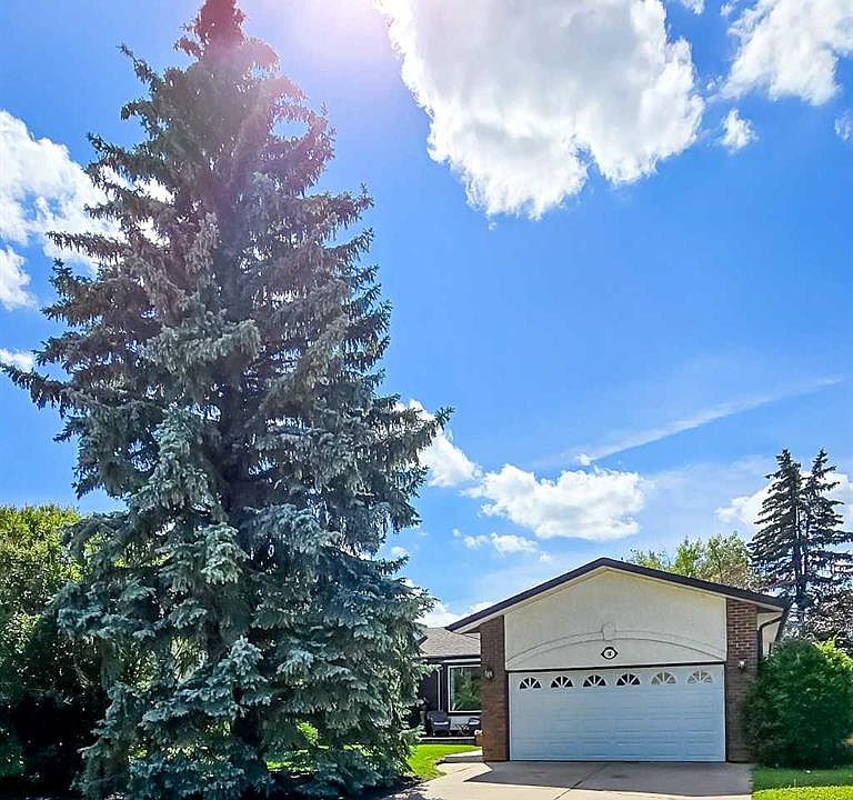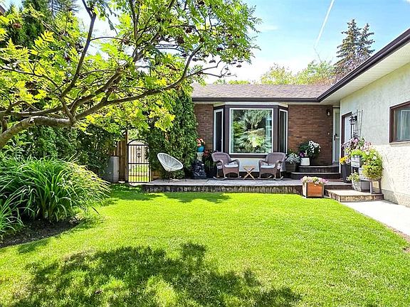 Morrisroe 5 Bedroom, 3 Bathroom Bungalow with Front Garage ~ This charming home in the heart of Morrisroe offers a warm, welcoming feel and a picture-perfect streetscape that suggests the home is where the heart is, as if in a year-round Hallmark scene. Surrounded by a mix of mature trees, the property features a fully fenced backyard and an east-facing ground-level front deck—an ideal spot for enjoying morning coffee and afternoon shade. Inside, the living room is anchored by a cozy brick-faced wood-burning fireplace with bookcases that will stay. The open-concept main living area is filled with natural light throughout the day with a lovely chandelier sparkling above the family dinner table. The kitchen offers wood cabinetry, a raised counter to allow guests to interact with the cook without being in the main flow of meal preparation, newer stainless steel appliances (including a convertible double oven), and a convenient prep sink overlooking the deck and yard. The main floor includes a 4-piece bathroom, two bedrooms, and the primary bedroom with a uniquely designed 3-piece ensuite. The fully developed basement adds exceptional flexibility, with two additional bedrooms (windows may not meet current egress), a large family room (the white 3-piece wall unit will stay), extra storage closet, a dedicated storage room, and utility room with laundry space. Step through the back door to the impressive backyard retreat. The huge deck—with partial covering—has long been a favourite spot for unwinding or hosting guests. Off to the side, a dog run keeps paws clean, especially helpful with the underground sprinklers that maintain the lush green lawn. The yard also includes a shed, firepit area, and garden beds. Notable Updates: New Electrical Neutral Line (2025) ~ Underground Sprinklers (2022) ~ Stainless Steel Kitchen Appliances (2020) ~ Vinyl Windows on Main Floor (2020) ~ Shingles & Eavestroughs (2020) ~ Fence (2014) ~ Roof Over Back Deck (2013) ~ Furnace (2012) & Furnace Blower (2023). This home is centrally located near several elementary school options, Eastview Middle School, the High Schools, and the Collicutt Centre—making it an ideal location for families. Photos were taken this past summer to showcase the remarkable yard.