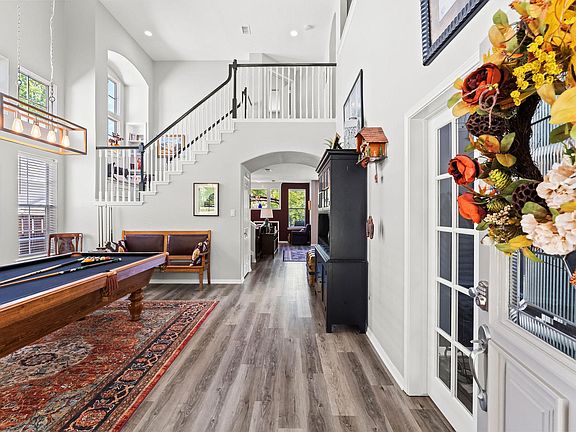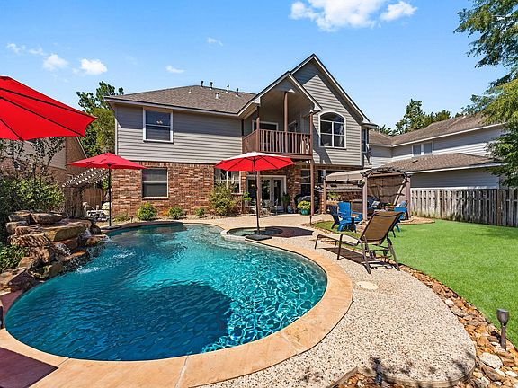 Beautiful 5 bedroom home backing to a true greenbelt. No carpet in home. Guest bedroom with private bath on 1st floor. High ceilings & open floor plan in formal living & dining room. First floor office with French doors. Family room is open to Kitchen and has gas log fireplace, TV niche, and greenbelt views. Kitchen boasts island with granite, breakfast bar, large pantry, and sunny breakfast room. Upstairs are four bedrooms, 3 baths, game room, and convenient laundry room. Owner's suite boasts a private covered balcony with pool and greenbelt views. En-suite bath with jetted tub, separate shower, dual sinks, vanity area, private commode, & huge walk-in closet. Three additional bedrooms up - 1 with private bath. Game room has recessed area for snack bar or reading area. Your outdoor entertaining area features a covered porch, covered gazebo with sunshade, firepit, and breathtaking pool/spa with rock waterfall. See list online of upgrades. Quiet neighborhood. See walk-thru video!