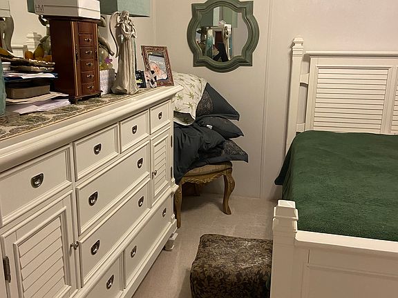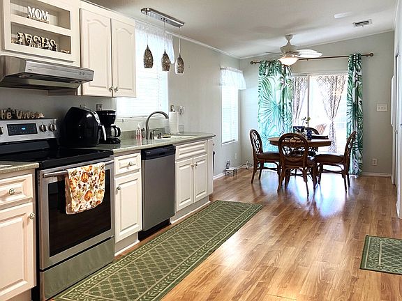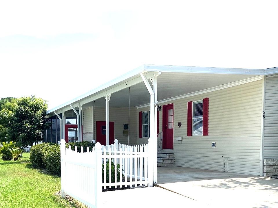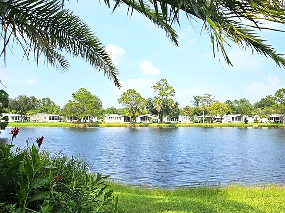 Reduced and Priced Right! This home is move-in ready! It has a beautiful full water view from the kitchen, dining areas & the glassed-in Florida room with adjoined screened porch & a patio! Perfect for hosting family & friends. The spacious kitchen has ample storage with a walk-in pantry and newer appliances. It is a split floorplan which keeps the Master with ensuite bath private. The Master bedroom boasts 2 generous closets and a recently remodeled bathroom. Both guest rooms have spacious closets. A lovely free standing electric fireplace will remain in the living room. Inside laundry and additional parking for a golf cart or visitors and an exterior utility room for additional storage. Bear Creek is a gated, 55 + community which offers homes on leased land. Visit our website to see all of our wonderful amenities and features!