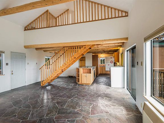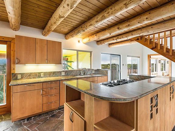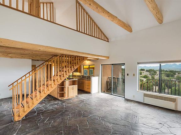 Privately located t the top of a country road (half a mile is a rough) is a spacious and custom Northern New Mexico Style residence with huge sunset and mountain views. Situated on 40 acres in Los Cerrillos, this distinctive property promotes opportunity for environmental conservation with state-of-the-art solar power, a private well, 1600 gallon water storage capacity, back-up generator, skylight, and built in greenhouse/solarium as well as chicken coop for plant and animal lovers. The home enjoys 2,090 square feet with finishes such as vigas and beams, slate and hardwood floors, custom railings, solar hot water and more. The floorplan is open and lends itself to the enjoyment of 360-degree views of natural landscape and big sky. The master wing includes a living area, fireplace and sleeping loft and there is a second loft bedroom with wooden staircase access that boasts stunning views through an outdoor patio. The two baths feature distinctive, natural design with slate accents in one. The kitchen is open-concept with Neil Kelly eco-friendly cabinetry and marble countertops is perfect for entertaining guests. Night sky stars to die for; see the whole Milky Way! Immerse yourself the incredible off-grid pleasures of country living, only 30 minutes from the historic Plaza of Santa Fe.