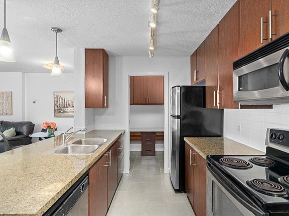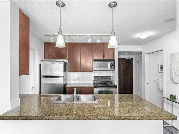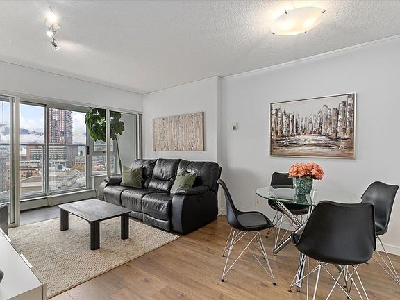 Check out this one-bedroom and den home offering city, mountain and partial water views in a prime downtown location. Featuring brand-new laminate flooring and fresh paint, this smart layout includes bar seating at the kitchen island, open living and dining areas, and a bright solarium. Enjoy in-suite laundry, secure parking, and a designated bike rack. The building’s amenities include an indoor pool, jacuzzi, sauna, gym, lounges, games room, garden courtyard, playground, and on-site security. Pet and short-term-rental friendly & just steps to groceries, dining, parks, entertainment and the SkyTrain.