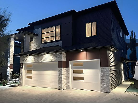 Modern 2,756 sq. ft. two-storey with 1,000 sq. ft. legal basement suite. Main level offers 9 ft. and 12 ft. ceilings, open dining area, and office with storage that could serve as a 7th bedroom. The kitchen includes 7 appliances: fridge, freezer, 2 ovens, gas range, microwave, dishwasher, plus a large walk-through pantry. Upstairs, the primary suite features a fireplace, 4-piece ensuite, walk-in closet with direct laundry access. A second bedroom includes a 3-piece ensuite and walk-in closet, while two additional bedrooms also have walk-in closets. Highlights include high-efficiency furnaces, A/C, HRV, large covered deck, and oversized heated triple garage with 12 ft. ceilings. The legal basement suite has 2 bedrooms, private entrance, large windows, full kitchen with appliances, in-suite laundry, and separate furnace. Exterior features year-round RV parking pad, driveway for up to 7 vehicles, and powered garden shed.