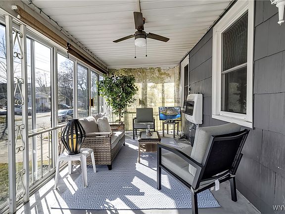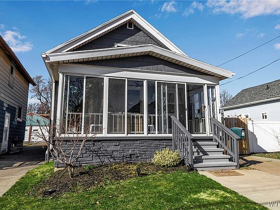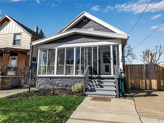 Welcome to this delightful home at 58 Lockwood Ave in South Buffalo! Nestled on a quiet one-way street, this charming property offers a blend of character and modern amenities. The home features 3 bedrooms with potential for a 4th, and boasts 1,012 square feet of living space. As you approach, you'll notice the home's phenomenal curb appeal with its freshly painted exterior and beautiful landscape. A highlight is the 4-season glassed front porch with gas heat, perfect for year-round enjoyment (not included in square footage- 18ft x 8ft). Step inside to discover a spacious kitchen and dining room, three comfortable bedrooms, and a large full bath with convenient laundry facilities on the main level. The flex room offers endless possibilities as a movie room or family hangout area. You'll appreciate the home's character, including unique wall finishings in the living room. Modern comforts include central air conditioning and on demand Hot Water ensuring your comfort throughout the seasons. Outside, you'll find a 2-car detached garage with electricity, a garage door opener and a convenient service door. The fully fenced 3,519 square foot lot provides privacy and ample space for outdoor activities. Located in a highly sought-after neighborhood, this home is close to local amenities and offers easy access to downtown and the suburbs. With its combination of charm, functionality, and location, 58 Lockwood Ave is a must-see property in South Buffalo!