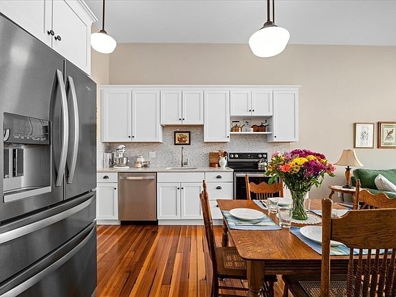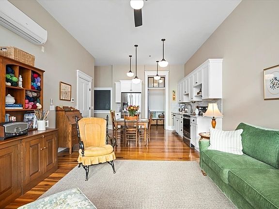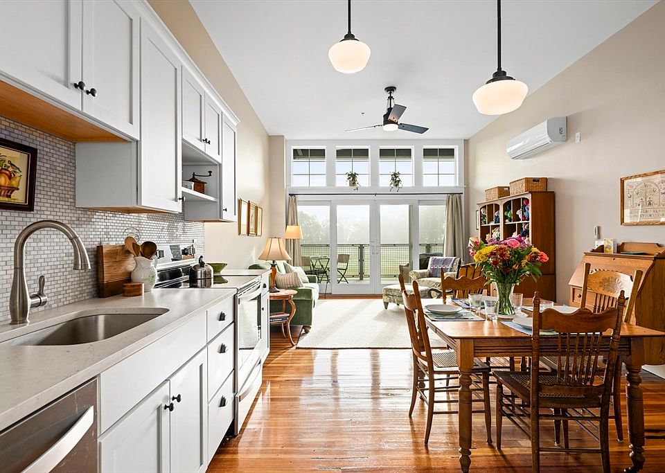 Light streams in the floor to ceiling windows in this lovely 2 Bedroom condo in the historic Hatfield Center School building. Newly renovated and tastefully restored condo in a 55+ community, beautiful woodwork, high ceilings and well thought out modern touches. The open plan living area offers big, beautiful views over river walk and Holyoke Range, and access to a beautiful sheltered deck for entertaining. Spacious new kitchen features, tiled backsplash, stainless appliances and a generous pantry with laundry and ample storage. Two spacious bedrooms, one with a generous walk in closet and slider to the deck, the other with original wainscot walls. Tiled bathroom features a generous walk in shower and linen closet. 1 car garage, with automatic door, elevator to 1st floor. Additional storage room in garage level. 2 pets allowed, dogs subject to breed restrictions. Non-smoking building. Close to town hall, community gardens, restaurants, senior center, river walk. Extra storage rm in bsm