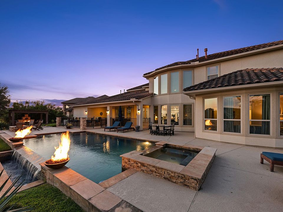 Hidden roomBuilt-in grills and refrigeratorCustom built wine storageFire pit with seatingLake viewsResort-style pool with spaPot filler faucet