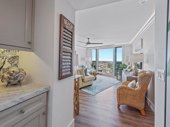 and Gulf can be seen from the living room with its new glass balcony railing. All windows and sliders are impact glass. Evening twinkling lights of the island can be viewed from the floor to ceiling windows from the kitchen. The magnificently updated kitchen with a savvy breakfast bar, Wolf appliances, wine fridge and gorgeous cabinetry make meal prep a dream! Wood look luxury vinyl flooring, crown molding, enhanced lighting, solid wood doors and beautifully updated bathrooms with walk-in showers are evidence that no detail was overlooked. Gulfview has a large heated pool, sun deck area, tiki hut, grills, beach access, community room, exercise room, extra storage, multi-level covered parking garage, bicycle storage, tennis, pickleball,