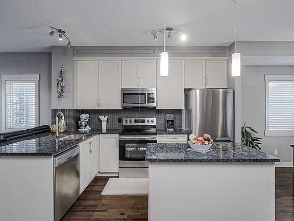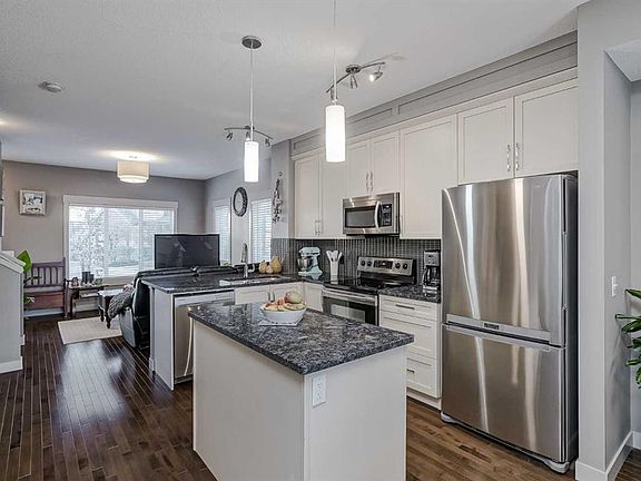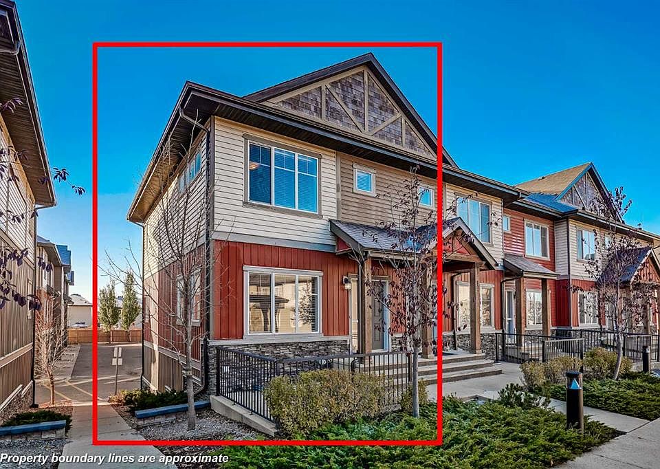 WELCOME TO SKYVIEW RANCH! This is the spacious, well-appointed home you have been waiting for—a true corner unit masterpiece ready for immediate enjoyment. Built in 2011, this bright and beautiful townhome was a former show-home, featuring an attached double car garage and a large, inviting front patio. Inside, the generous 1,100 sq. ft. floor plan is designed for modern living. The main level boasts beautiful hardwood floors throughout and an open-concept layout centered around a functional kitchen. This space is equipped with elegant granite countertops, ample cabinet storage, and flows perfectly into a generously sized dining room. Large windows flood the living space with natural daylight, and a versatile nook offers the ideal spot for a home office or den. Upstairs, a large primary bedroom awaits, complete with its own private ensuite and loads of closet space. Down the hall, two wonderfully arranged bedrooms share a full bathroom. Located in the heart of Skyview Ranch, this home offers an unbeatable lifestyle. You are just steps away from local playgrounds, schools, and shopping. Combining convenience, space, and a premium location, this home truly is perfect for everyone!