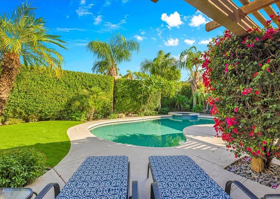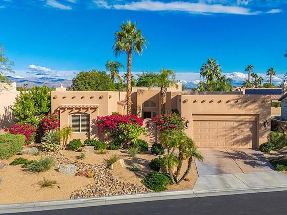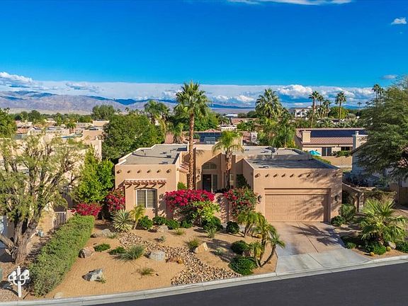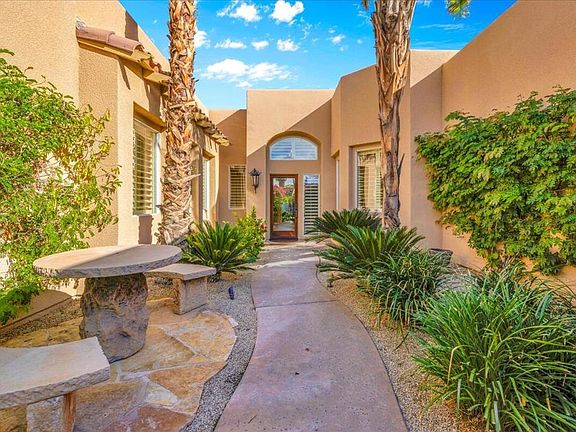 Welcome to Tucson--an intimate, gated enclave of just 72 Santa Fe-style homes crafted by award-winning builder Lance Alcano. This meticulously maintained Sedona model is a rare offering, showcasing true pride of ownership, thoughtful upgrades, and an exceptional indoor/outdoor lifestyle just minutes from the Indian Wells Tennis Garden, the Coachella Music & Arts Festivals, Desert Willow Golf; with steeply discounted resident rates!From the moment you step through the private, key-coded courtyard with its Spanish-style wooden door and fountain, you'll sense the quality and warmth of this home. Volumenous ceilings, wood shutters, custom paint, stone accents, and rich wood flooring create an inviting, light-filled ambiance throughout.The open great room is anchored by a striking stone fireplace, built-in media center, surround sound, and a stylish bar with wine refrigerator--food / beverage drawers; perfect for entertaining. The upgraded kitchen features slab granite counters, abundant cabinetry, Stainless Steel Wolf range, SubZero refrigerator, a double oven, with both a breakfast nook and a separate formal dining room nearby.The primary suite is a true retreat, offering patio access, a walk-in closet plus mirrored wardrobe, and a spacious bath with dual vanities, separate tub, and enclosed shower. All guest bedrooms are generously sized. Additional features include ceiling fans throughout, dual-pane windows/sliders, a dedicated laundry room, fresh interior/exterior paint, and newer HVAC. Home also includes an evaporative cooling system (never used by part-time owners).Step outside to your own private desert oasis with lush landscaping, landscape accent lighting, green space, a newly refinished sparkling saltwater pool and elevated spa, newer equipment, covered patio, misters, and outdoor kitchen. The epoxy-finished garage offers extensive built-in cabinetry for exceptional storage.Beautifully maintained, rich in character, and designed for effortless entertaining, this stunning Southwestern hacienda is the lifestyle home you've been waiting for. Quality furnishings available outside escrow.