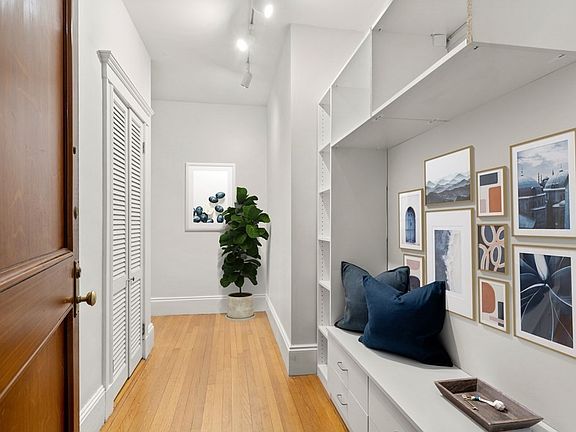 At the heart of Brookline’s coveted Coolidge Corner, this 2 bedroom, 2 full bathroom corner duplex features a foyer with custom built-ins and two closets with ample storage. The corridor leads to an expansive living room highlighted by soaring 9ft ceilings and oversized south-west facing windows. Off the living room is a galley style kitchen, which opens to a large screened-in porch and private deck. The first floor also features a sizable guest bedroom with two closets and full bathroom with a tub and linen closet. The spiral staircase leads to a recently renovated primary suite, offering a custom walk-in closet and spa-like bathroom with a glass enclosed shower and heated towel bar. This home is complete with an in-unit washer and dryer, air conditioning, and storage room.