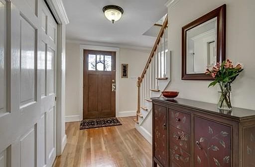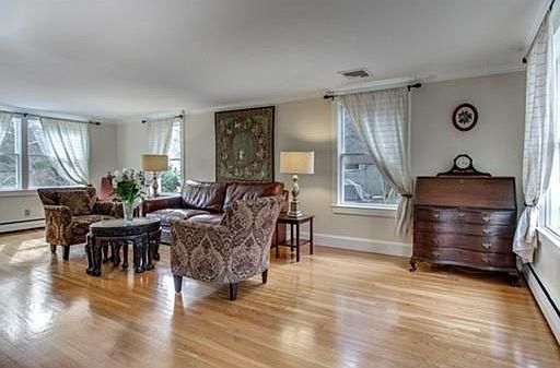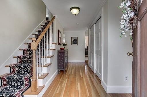Overlooking tranquil Sportsman's Pond, this classic Garrison Colonial offers views to behold & an interior to cherish.Traditional formal DR w/fireplace & china cabinet accommodates entertaining. Sunny, front-to-back LR features custom built-ins & media center.Gaze out over the pond while relaxing in the sun-splashed family room. Warm, honey-toned eat-in kitchen with granite, cherry cabinets.First floor half bath doubles as laundry room.Sublime master suite w/cathedral ceiling opens to office/sitting area graced with walls of windows.Embrace stunning views of the terraced stone steps, perennial garden & fruit trees leading to pond. Updated master bath w/marble vanity, vessel sink. Three generous corner BR maximize space, sunlight. Family bath. Partially finished Berber carpet LL features rec room & walkout access to backyard.Workshop, cedar closet, SS water heater, 200 amp electric, central a/c complete the many features.Walk to town, commuter rail & dining from this prime location!