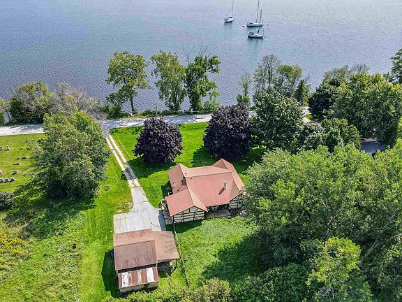 Year-round lakefront home for sale located just over the bridge in South Alburgh with 200 ft of frontage on Lake Champlain. Set on 1 acre, perched on a hill with views of the lake is this spacious one-level home with a finished basement gives you over 3,600 sqft of living space. The first level has an open kitchen and large living area with lake views as well as three bedrooms, a half bathroom, and a full bathroom with a whirlpool tub. The basement has five additional rooms, a full bathroom, and a pellet stove giving you lots of options for the space. The attached one-car garage and detached one-car garage/workshop give you plenty of space for storage. Watch the sunrise on the lakeside deck and easily access the water via the wooden staircase. The gradual lakeshore is ideal for launching a kayak. Lakeside living is just an hour to Burlington and 35 minutes to St Albans City.