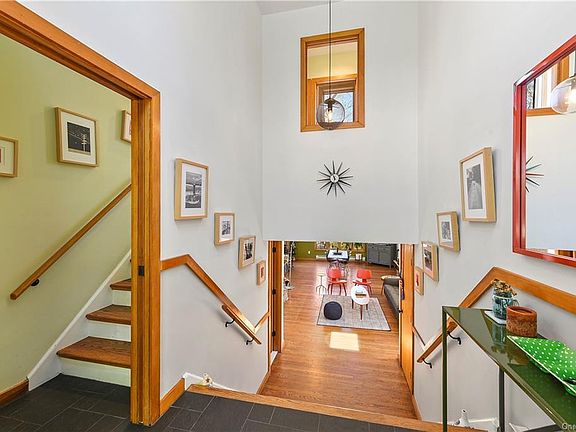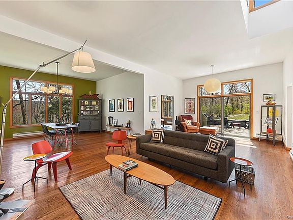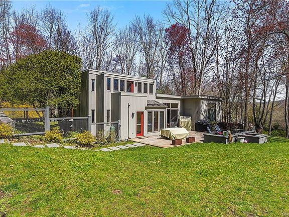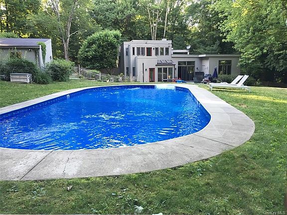 PRIVATE MODERN RETREAT - Long drive to peaceful privacy. Sophisticated Modern with clean lines. Open floorplan designed for today s lifestyle. Two-story Entry with clerestory opening to dramatic Great Room with fireplace. Informal living and dining areas with doors to rear deck with firepit. Kitchen with skylit Breakfast Area. Private Master Suite with Walk-in Closet, marble Bath, Office/Nursery and two private porches. Two additional Bedrooms each with ensuite Baths. Over two acres with rolling lawns and specimen shrubs. Swimming Pool and Half Basketball Court. Quiet country road with easy access to Cross River, Katonah and commuting arteries.