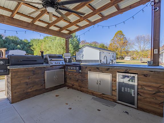 Beautiful landscapingCharming front porchBarn-style sliding doorBuilt-in grill areaLarge yardBold accent wallCovered outdoor kitchen