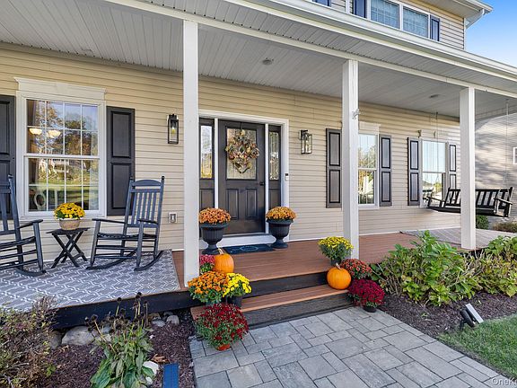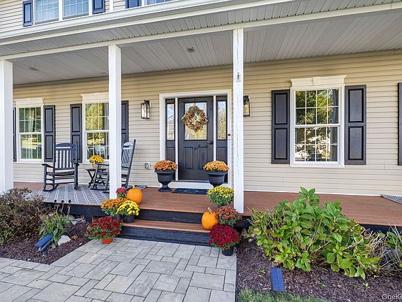 This stunning New Windsor Colonial is perfectly situated on a 1-acre lot in the sought-after Windsor Woods subdivision. Backing up to woods, this property enjoys a peaceful backdrop of protected green space that will remain undeveloped. This home offers wonderful curb appeal with its inviting front porch with swing and paver walkway, all in a highly desirable neighborhood that blends natural beauty, community, and convenience. A warm, welcoming entryway leading to a living room with barn doors, ideal as a private office or den. The spacious kitchen has been beautifully refreshed with quartz countertops, pantry and stainless appliances, flowing seamlessly into the family room featuring a gas fireplace and triple windows overlooking views of the wooded backyard. Enjoy outdoor living on the deck and patio, the perfect setting for entertaining or relaxing in the private backyard. Upstairs, the primary suite offers a walk-in closet and large ensuite bath with double sinks, whirlpool tub, and separate shower. Three additional bedrooms and 2nd full Bath provide ample space for family or guests. The full unfinished walk-out basement with sliders and full windows to patio overlooks the backyard, offering endless potential for future living space, multigenerational use, or recreation. Additional highlights include a freshly painted interior, energy efficient dual central air, attached 2-car garage interior painted with newer garage doors, and all municipal services. Perfectly located for commuters — less than 10 minutes to I-84 and Thruway, and 5 minutes to the Salisbury Mills Train Station — easy access to West Point and Woodbury Commons. This Hudson Valley home truly combines comfort, style, and convenience.