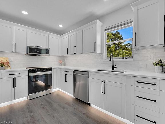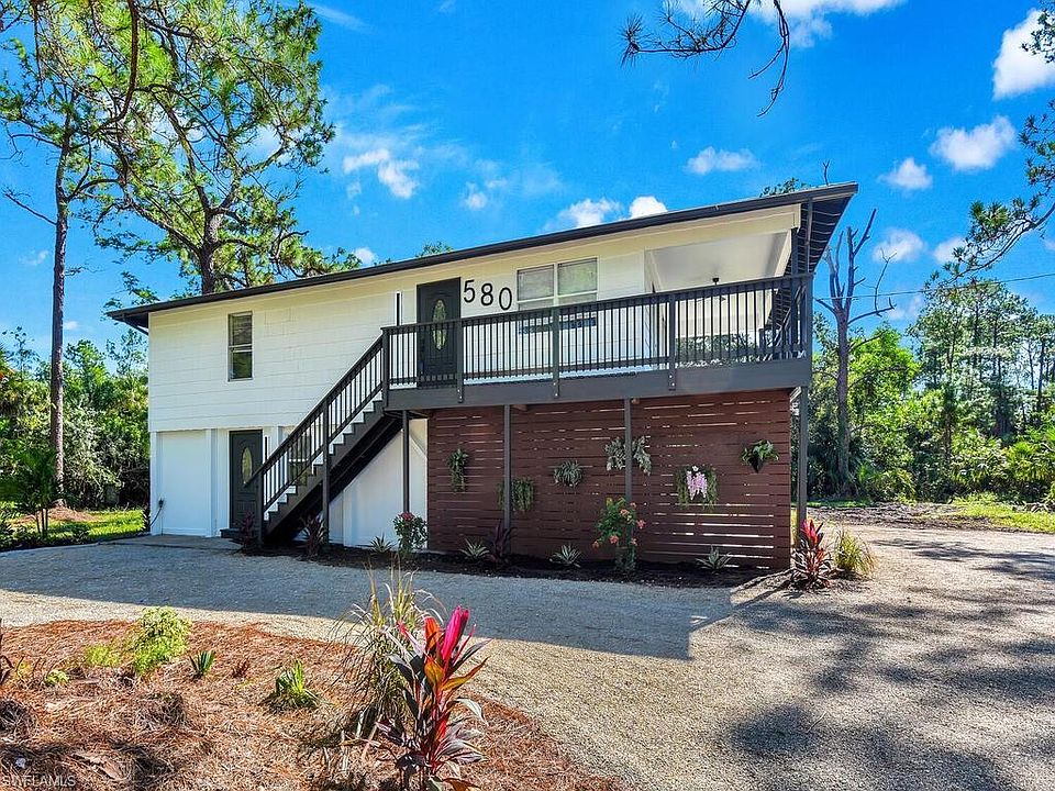 Beautifully refreshed single family home located on 2.73 Acres in "Close-in" Golden Gate Estates. This home has been updated so you can move right in. The main level of this home has 2 bedrooms, 2 bathrooms, large kitchen, living room, dining area and contains approximately 1,000 square feet of living area. The lower level has 2 bedrooms, 1 bath, a living room and kitchenette. The home is set up for multi-generational living with separate living area for the family and extended family. Other features include a large covered porch on the 2nd level overlooking the peacefully front yard, an oversized 2 car carport/covered parking area with laundry area, and a detached pole barn. The 2.73 Acres is 100% uplands for your future development. Recent improvements include: new roof, new paint inside and out, new wide plank vinyl "wood Look" flooring, new bathrooms, new kitchens with quartz countertops, new stainless steel appliances in both the main living area kitchen and in-law suite, new fans, lighting, doors, and trim. This is a great opportunity to own 2.73 acres with a large updated home for this price. Final finishes are being done to the home and will be completed prior to closing. The home will have a new whole house Reverse Osmosis system and new drain field prior to closing. No FHA financing due to 90 day flip rule. Hurry wont last.