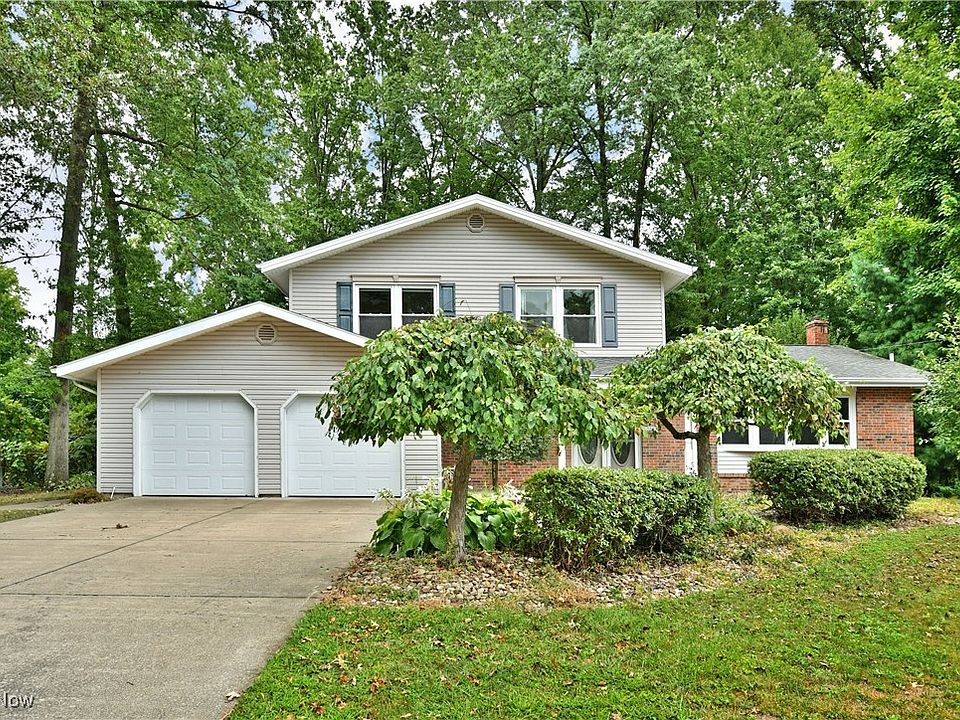 Your wait is over, the one you’ve been waiting on is hitting the market with a sprawling four-bedroom, move-in-ready layout! The stunning Howland residence awaits your attention as its tucked away within a highly desirable neighborhood, wrapped in a tree lined lot. Handsome brick work accents the covered front porch as a two car attached garage graces the cement driveway. A fenced-in backyard brings park-like views, a huge rear patio and a bonus storage shed. Step through the dual entry doors to find a mirror and tile lined foyer. The raised living room takes full advantage of its four-pane bay window as stone wrapped stairs lead to the second-floor bedrooms. Around the corner, formal dining brings decorative lighting and soft carpets. The central kitchen boasts floor to ceiling cabinetry and stainless-steel appliances. Dropping down, the dining area enjoys immediate patio access. Meanwhile, a colorful first floor guest bedroom sits across from a like-styled half bath. Completing the floor, a must-see rear family room showcases its hall-like presence, wowing with its pent roof and window lined rear section. Multiple skylights add to the allure. The stone shod fireplace seals the deal. Upstairs, the four engaging bedrooms line the main hall to include the larger master suite and its full private bath. A second full bath sits mid hall with its relaxing soaking tub. Down below, a partially finished basement allows for easy storage and utility access.