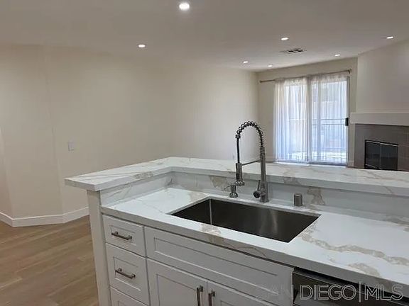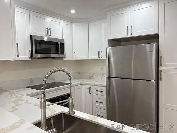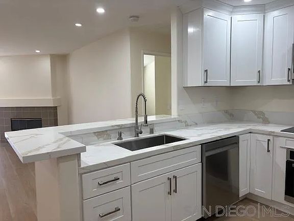 Stunning Remodeled Penthouse Condo with Vaulted Ceilings & Resort-Style Amenities. Just remodeled and move-in ready, this beautiful penthouse condo combines modern style with convenience and comfort. The sleek new kitchen opens to a spacious living room featuring vaulted ceilings, a cozy fireplace, and access to a private deck perfect for entertaining or relaxing. Enjoy newer appliances, all-new LVP flooring throughout, and recessed lighting that brightens every space. The large primary suite includes dual closets with custom built-ins and a luxurious bath with brand-new double-sink vanities. A full laundry closet adds extra convenience. The community offers exceptional amenities, including a fitness center, expansive pool, and recreation area. Two gated garage parking spaces plus guest parking make life easy. All this in a prime location just steps from shopping, dining, and the trolley, with everything San Diego has to offer only 20 minutes away!