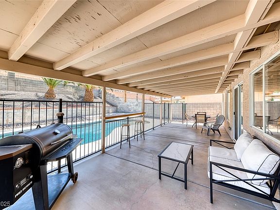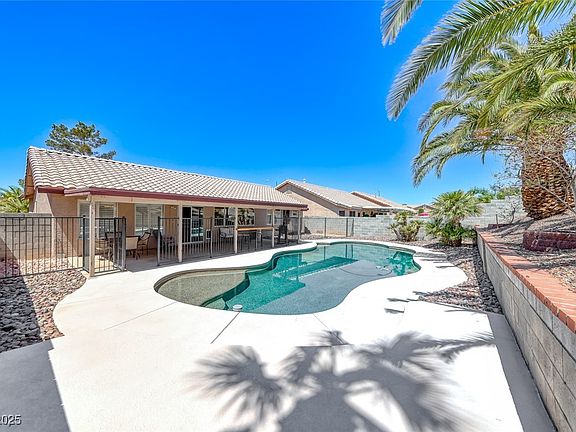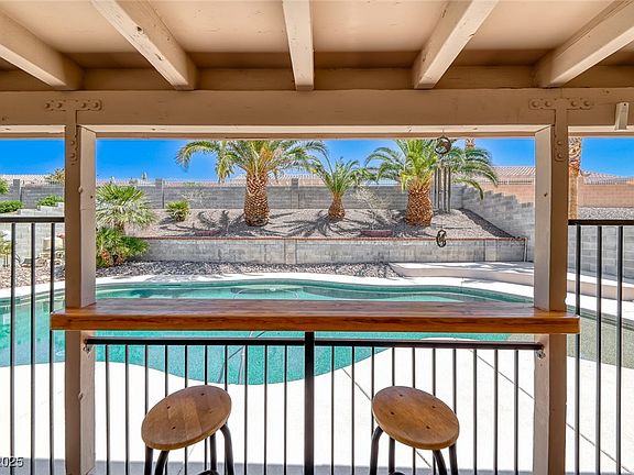 Warm & Welcoming Single Story W/ Gated PebbleTec Pool & 3 Car Garage Located in Henderson, Minutes To River Mountain Trail. Backyard W/ Elevated Buffer Space Between Neighbor Offering Additional Privacy. Warm Tones, Vaulted Ceilings & Cozy Open Floorplan Greets You As You Enter. Shutters & Solar Screens Throughout. Bedrooms On Opposite Ends W/ Living Room As The Centerpiece. Kitchen Features Quartz Countertops, Walk-In Pantry, White Shaker Cabinets & Breakfast Bar For Additional Seating. Sizable Primary Bedroom W/ Bay Window Seating That Looks Out To Pool Area. Large Walk-in Closet, Dual Sinks, Gorgeous Granite Counter & Shower Wall, Make-Up Table & Massive Vanity In Primary Bathroom. Water Softener & Garage Shelving Incl. Extended Covered Patio in Easy To Maintain Backyard Offering Plenty of Shade & Space to Gather. Large PebbleTec Pool W/ Surrounding Safety Gate & Built-in Bar. Recently Refinished Wet Deck. Near Freeway, Shopping & Heritage Park. 20 Minute Drive to Boulder City!