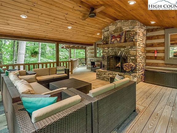 Step into Stonebridge, a community of antique log cabins located just a short 15-minute drive from West Jefferson and only 30 minutes from Boone and Blowing Rock. Stonebridge offers a mix of historic charm and modern amenities. Indulge in the art scene, savor delicious meals at locally owned restaurants, explore craft breweries, and browse through quaint shops—all while basking in the peaceful ambiance of a mountain sanctuary. This meticulously designed log cabin features an inviting open layout. The main floor showcases a kitchen, a cozy great room adorned with a striking stone fireplace, and an intimate dining space. The primary bedroom provides access to the back deck, while a full bathroom with a walk-in tile shower and a convenient laundry area adds convenience to daily living. Upstairs the loft offers sleeping quarters along with ample closet space and a full bathroom featuring a tub shower combination—perfect for accommodating guests and loved ones. The lower level boasts a family room with a gas fireplace and another sizable bedroom with a private full bathroom featuring a walk-in shower for added privacy and comfort. The outdoor living areas are equally impressive. Unwind on the back deck or host gatherings in the spacious pavilion equipped with its own wood-burning fireplace—ideal for year-round entertainment. The cabin has been nicely improved with additions, such as a recently installed roof, a whole house generator, a water filtration system, and central air conditioning. Additionally, the property boasts an oversized 2-car garage with space for a workshop and an additional beautifully finished bonus room above it that includes a small kitchenette, living area, and half bathroom—ideal for hosting guests or creating extra living space. Whether looking for a home or a getaway retreat, this log cabin provides Stonebridge with a tranquil and charming lifestyle.