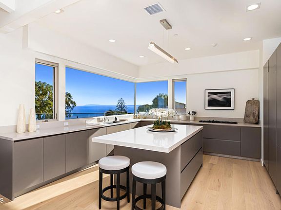 Exceptional modern residence and brand-new construction showcasing spectacular ocean and island views. Situated on a hillside, this private and gated contemporary home features an open concept floor plan with 3 beds, 3.5 baths, a spacious and luxe living room with a stone fireplace, vaulted ceilings, and expansive glass doors that offer panoramic ocean vistas, seamlessly connecting the indoors with the outdoors on the spacious patio. The gourmet kitchen is fully integrated with high-end appliances, a large center island, exquisite Italian cabinetry, and custom fixtures. The primary suite enjoys large windows framing picturesque ocean views, an ensuite bath, a walk-in closet, and direct access to a patio with a jacuzzi. With an abundance of natural light, sleek design, and elegant interiors, this residence emanates a warm and inviting ambiance, while effortlessly blending comfort and sophistication. Conveniently located to beaches, harbor, and charming downtown Ventura.