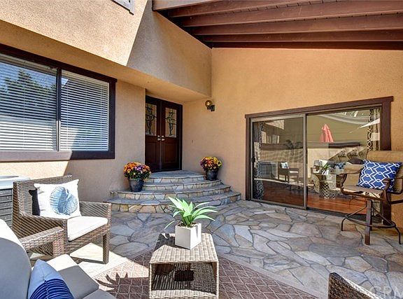 Beautiful Old Ranch Townhome with 2077 SF of luxury living at it's best! Enter through your private gated courtyard w/attractive custom slate patio & porch. You'll soon discover a spectacular split level spacious interior floor plan with soaring vaulted ceiling in the living room plus a brick fireplace that opens onto the outdoor patio courtyard expanding entertaining possibilities. The gracious raised formal dining room has a convenient built-in buffet and overlooks the living room. A desirable mid-level bedroom and full bath ideal for visiting guests. The cheerful "white" kitchen includes a gas cooktop, double ovens and a charming breakfast nook area w/ private balcony for BBQing... If you love entertaining this just may be your dream home! The palatial upstairs master suite boasts an impressive private retreat (in-home office, workout room or possibly all 3)! The stately master bedroom is remarkable and includes a master bath with two sinks/vanities as well as two walk-in closets . Additional amenities include beautiful laminate wood flooring in the living room, dining room, downstairs hallway, smooth textured ceilings, new carpeting, plantation shutters, central air conditioning, hallway skylight, amazing storage capacity, prime location and spacious two car attached garage. As an Old Ranch Townhome owner you will enjoy the community pool, spa & clubhouse as well as the lushly landscaped and well maintained grounds. Highly acclaimed Los Al Schoo