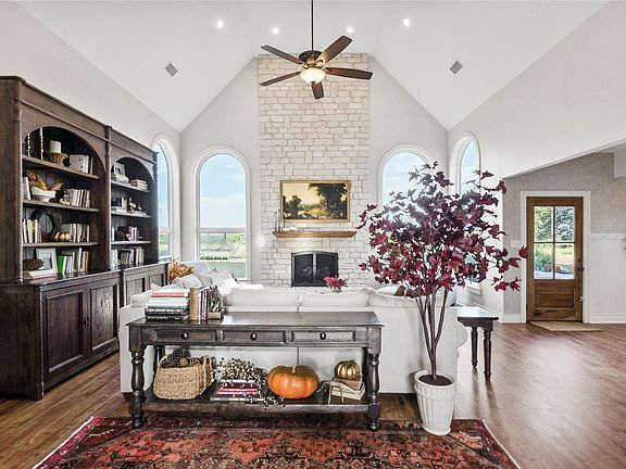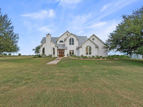 With 4 bedrooms, 3.5 baths, and a spacious 2-car garage, this home redefines luxury amidst 8.5 ag-exempted acres of scenic views featuring fields of bluebonnets, Indian paintbrushes, and some of the most colorful and stunning sunsets. Discover a home beautifully upgraded with new windows, luxury vinyl plank flooring, and fresh trim and paint throughout. The tall ceilings and open kitchen, featuring a large island and second sink. The brick laid floor in the large mudroom brings a practicality and aesthetic to a space that could also double as a butler pantry. For added peace of mind, a secret safe room acts as a storm shelter. A newly lime washed exterior brick enhances curb appeal, while the large back patio is perfect for entertaining or sitting around the fire pit. The exterior storage shed boasts two powered commercial-sized roll-up doors and second-story storage. Epoxy garage floors, a fenced-off garden area, and a charming chicken coop enhance this property's charm.