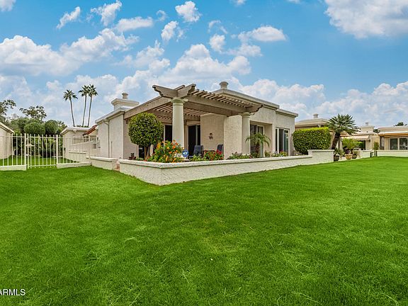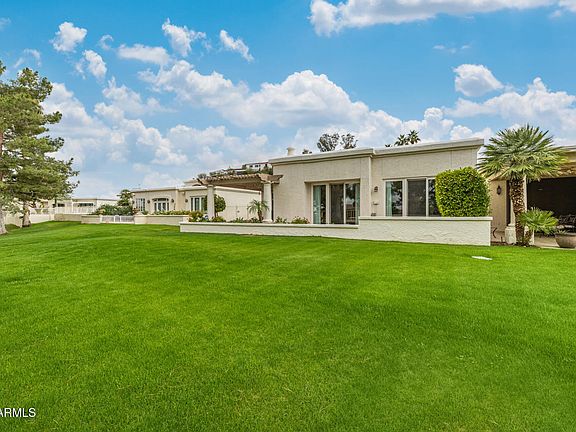 The updated kitchen features granite counters, stainless appliances, and a breakfast bar that opens seamlessly to a light-filled dining area under a soaring ceiling. A sleek wet bar makes hosting effortless. The cozy den, complete with fireplace and private patio door, could be converted to a true third bedroom in minutes. Generous primary suite offers fairway views, a quiet sitting nook, luxurious onyx counters, walk-in shower, separate tub, and dual closets. Travertine and bamboo flooring flow throughout. Plenty of room to add a third bathroom if desired. Major systems have been updated: roof, both A/C units, water heaters - 1 new as of Sept. 2025, and Pella windows and sliders. Attached two-car garage with storage cabinets. Walk to the Arizona Canal Trail or Adobe clubhouse and restaurant; just minutes to Phoenix Mountain Preserve and Biltmore Fashion Park. Rare lot, rare views, ready for its next chapter.