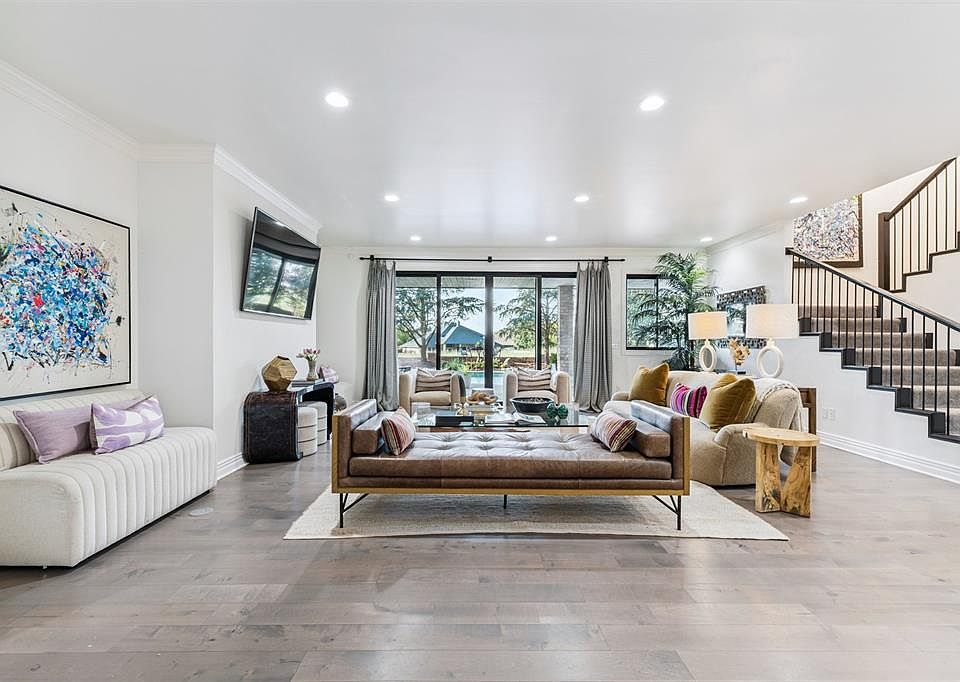 Upon entering the home, you will be greeted by a spacious great room featuring a full wine bar, ice maker, fireplace, blue tooth surround sound system throughout entire home. The open-concept kitchen, recently remodeled, flows into the living room with views of the pool and golf course. The luxurious master bedroom includes a seating area, coffee bar, dual His and Hers walk-in closets. The master bath is equipped with a Kohler Rain Steam shower with Bluetooth, dual toilets (one with access to the pool area), and a lavish design.
