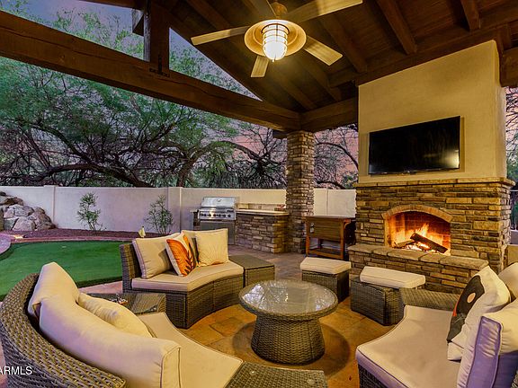 Experience privacy, space, and breathtaking Camelback Mountain views from this exceptional residence, set on an oversized lot in Heritage Hills. Featuring 4 bedrooms, 2.5 bathrooms, and 2,712 sqft of living space. Elegant travertine flooring flows through the main living areas and into the primary suite, which boasts its own private courtyard with 10-person spa with stone water feature, and garden. The additional guest bedrooms are generously sized, ensuring comfort. Multiple living spaces create an inviting atmosphere: a large family room with fireplace and wet bar for entertaining, a living room with a dry bar connects seamlessly to the dining area and private patio, and a gourmet kitchen outfitted with Thermador stainless steel appliances, a gas cooktop, oven and microwave/ convection oven, granite counters, and a farmhouse stone sink. Step outside and enjoy resort-style living in your own backyard. An expansive covered patio with fireplace, built-in TV, and outdoor grill sets the stage for year-round gatherings. The sparkling pool with rock water feature, lush green lawn, putting greens, and panoramic mountain vistas make this outdoor space truly unforgettable. Whether you're relaxing inside or taking in the views outdoors, this home offers the perfect blend of comfort, style, and Arizona living at its finest. 50 amp outlet in garage ready for level 2 EV charger.