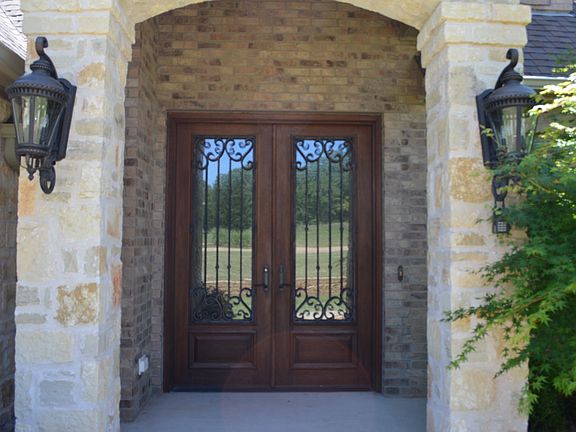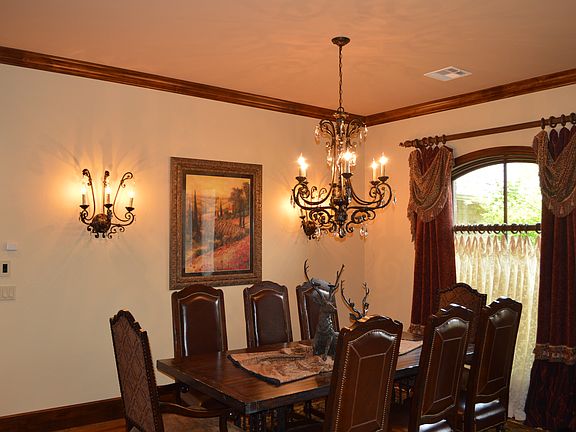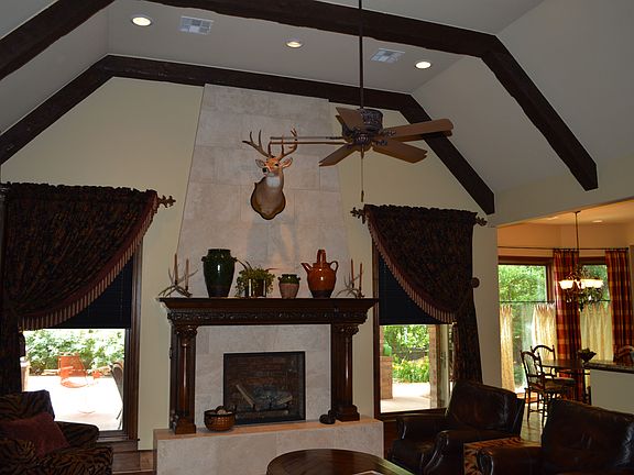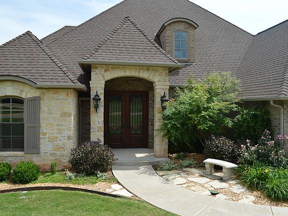 Beautiful custom-built Ron Walker, one level home in the prestigious Boulder Creek addition. Grand front entry, double doors lead into the formal dining/open living area with 5" hand-scraped Hickory flooring. Living area boasts 14' Travertine fireplace with 7.5' mantel and rustic beams. Private study with an abundance of built-ins and wood flooring. Split bedroom arrangement. Master suite with large windows, in suite master bath includes granite lavatory, surround tub, fully tiled walk-in shower, large walk-in closet and separate storm shelter/safe room that also serves as an additional closet. Kitchen has an abundance of cabinets and storage, center island, granite countertops, attached breakfast eating area with top of the line appliances. Flex room off the kitchen provides an option for an additional living area or office area. Two additional bedrooms share a bath that includes 2 sinks, shower/tub combo. Large laundry with folding area. Garage features fully finished bonus room which can be used as an additional bedroom, living area, or workout room. Third bay, separate garage is perfect for boat storage, golf cart or the additional vehicle. Outdoor has covered back patio, fireplace, built-in grill, granite mantel, TV and surround sound. Home features Pella windows, Elk 50-year shingles, circulating hot water, indoor/outdoor stereo system, central vac, 3 built-in linen closets, and hidden coat closet. Perfectly maintained - you won't want to miss this one!