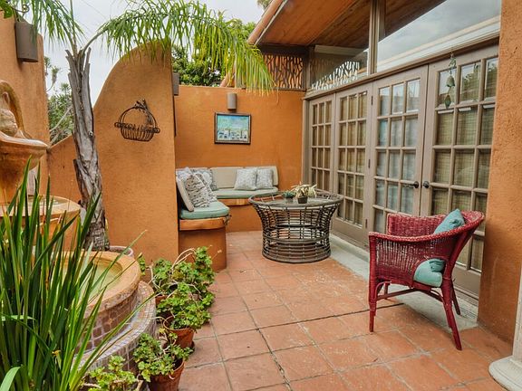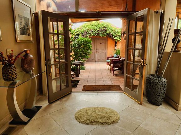 Koi pondLarge fountainStone paved entry courtyardOriginal artworkHuge palm treesLarge leafy plantsHigh arched open area