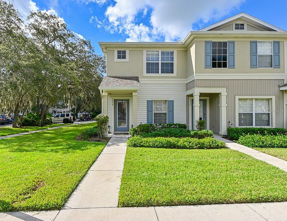 Welcome to the heavenly and serene highly sought after FISHHAWK Ridge community. This exquisite END UNIT, two bedroom, 2 1/2 bath townhome is nestled in a quiet preserve with A rated schools! Step inside to an oversized great room complete with a chefs kitchen featuring granite counter tops and stainless steal appliances. Upstairs you will find two generous sized bedrooms and two full baths. The laundry area is upstairs as well. In the back of the home is a cozy little outdoor space with a covered screened lanai overlooking conservation perfect for sipping your morning coffee! This welcoming home is in a GREAT location surrounded by 25+ miles of walking trails! Schedule a showing today and experience the best of FishHawk Ranch living in this charming community.