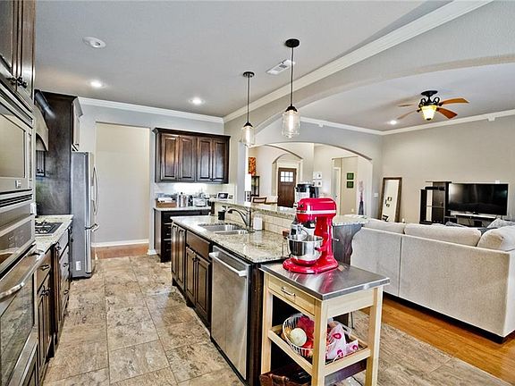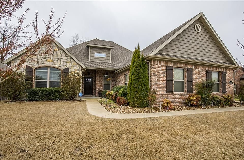 you will LOVE watching the Beautiful Arkansas sunsets from the covered patio. Spacious backyard with no neighbors/homes behind. Like new home located in highly desirable subdivision. Wood floors in living areas and master bedroom. Open floor plan between living area, dining areas, and kitchen. Granite countertops with custom built cabinets. Spacious 3-car sideload garage with storm shelter.