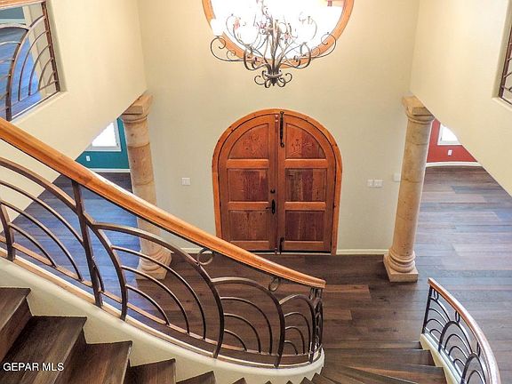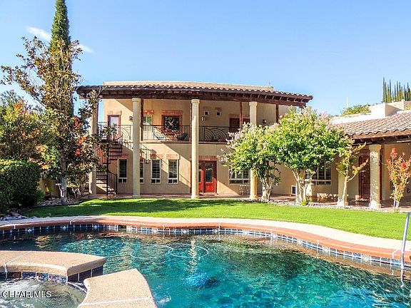 Southwest style with an immense amount of top of the line custom finishes & attributes. Private courtyard entry. Above the arched wood front door is a beautiful stained glass work of art. Winding staircase as you enter that is quite the show piece. Formal Living and Formal Dining. Den has corner fireplace, beamed ceiling, built in entertainment center & full bar area. Breakfast area in the breezeway, also with beamed ceiling. Gorgeous kitchen has GE Monogram appliances, TV, island with sink, wine fridge, dish display rack in cabinet above main sink. Media room has exit doors to driveway & backyard, small bar area & large flat screen TV. Oversized utility room with plenty of cabinet space, sink, washer & dryer. 1 bedroom on 1st floor has walk-in closet & 3/4 bath in blue talavera design. 2nd level has utility closet with sink. Master BD with door to large balcony & large TV. Master bath has 2 sinks, jet tub, separate steam shower, commode room & huge cedar closet. 2 additional bedrooms & baths. Loft/Office.
